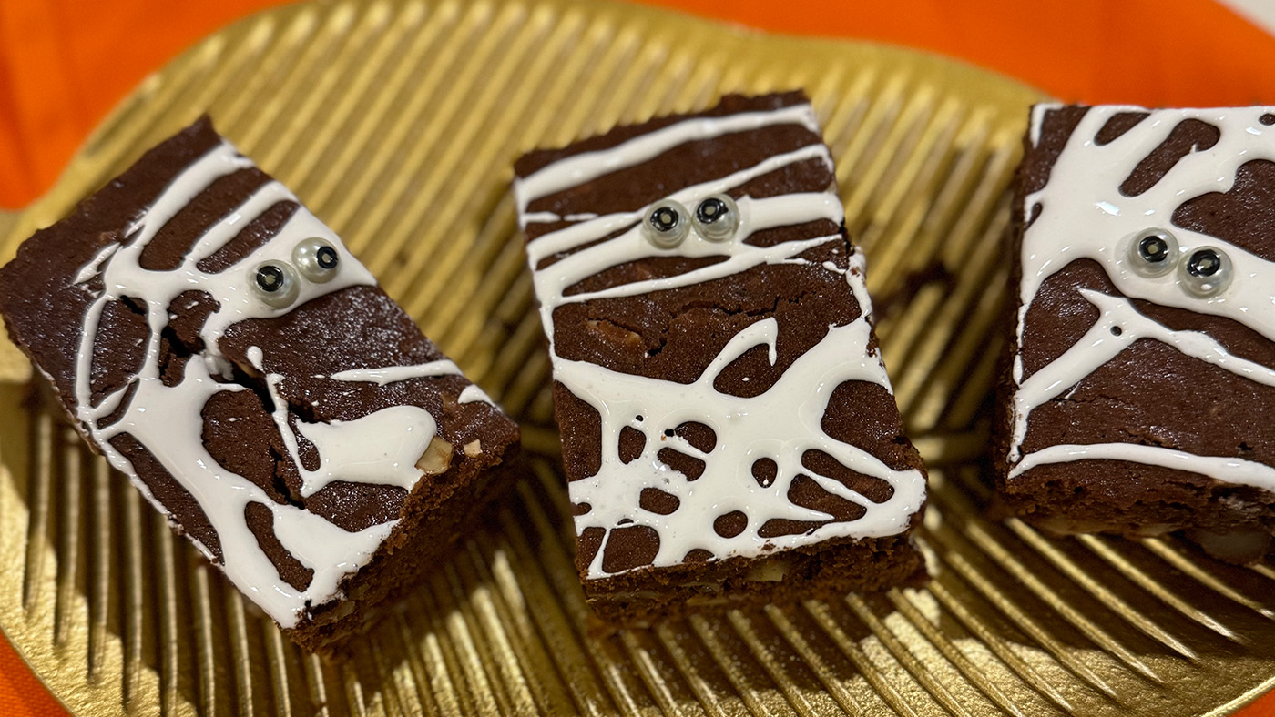 - Una vez cocinado y frío, con ayuda de una cuchara, colocar el malvavisco derretido sobre el brownie cocinado, formando una tela de araña. Colocar los ojitos a las arañas y estarán espeluznantemente listos para comer.