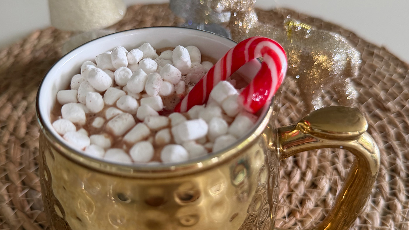 Colocar en tu taza de preferencia y agregar los malvaviscos y bastones de menta