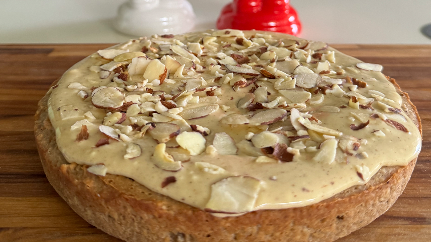 - Desmoldar el queque y una vez que esté ligeramente frío, colocar el lustre sobre el queque y las almendras fileteadas para decorar.